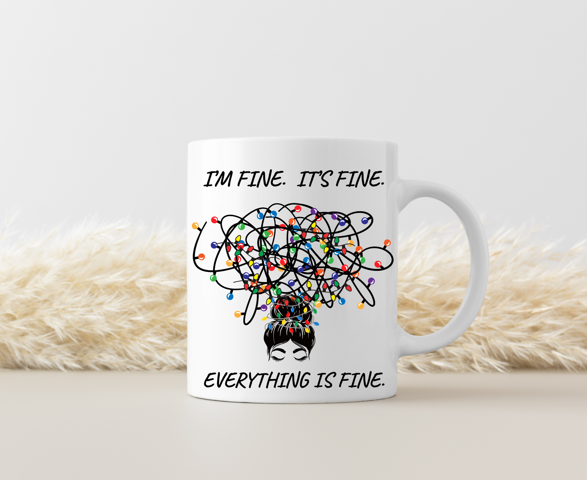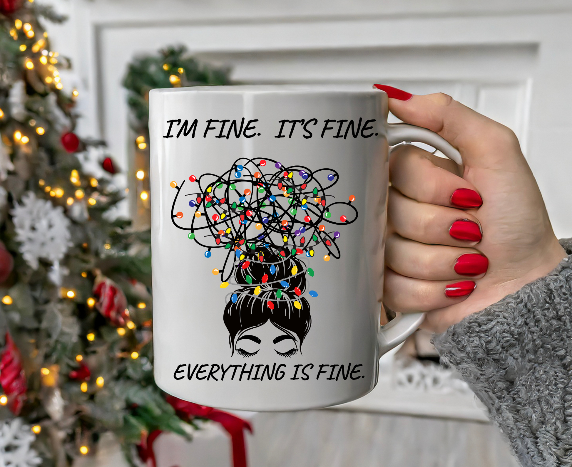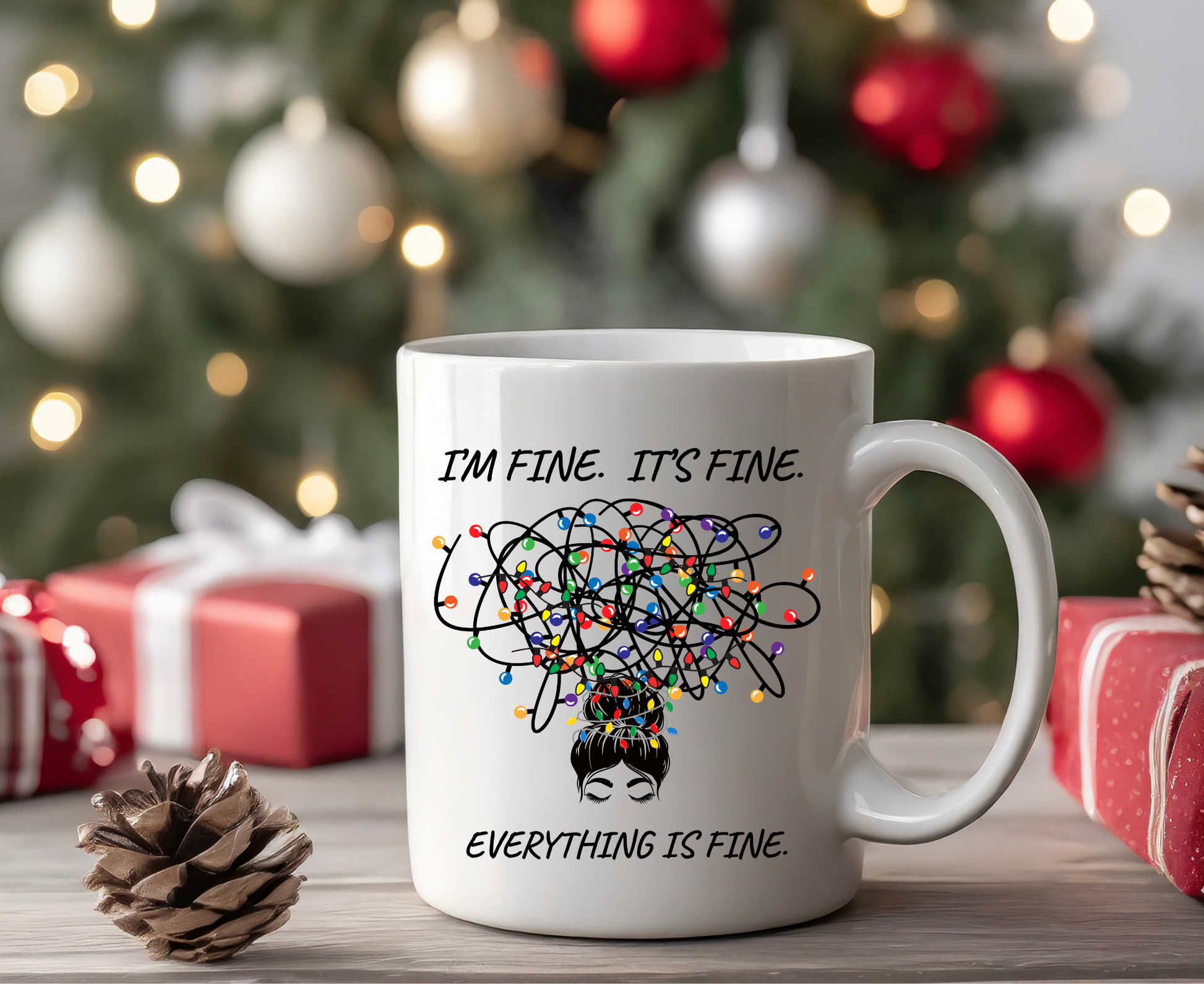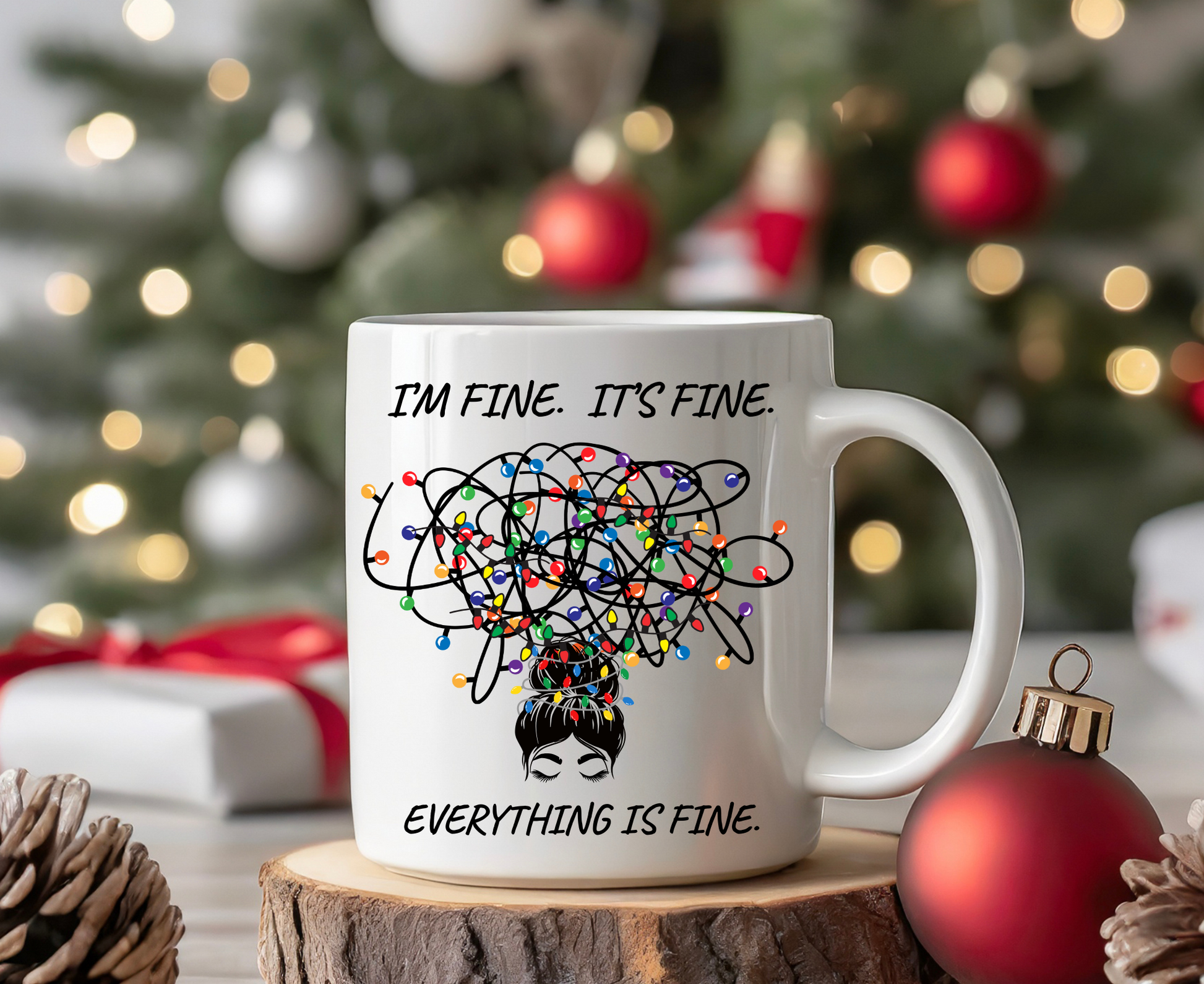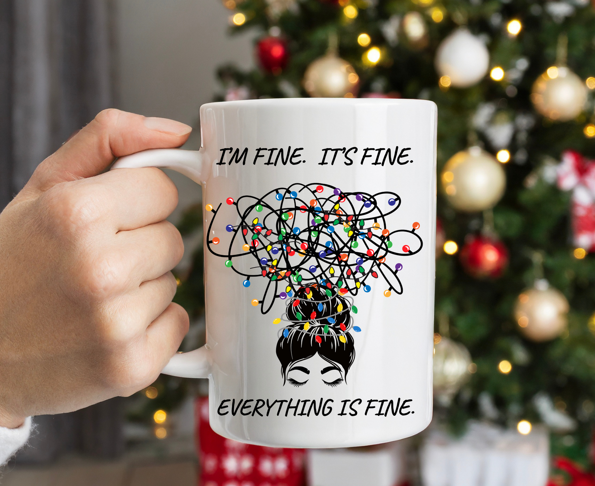 Everything Is Fine Mug | Funny Coffee Cup with Messy Bun Girl & Tangled Holiday Lights | Sarcastic Christmas Gift for Her | Christmas Gift