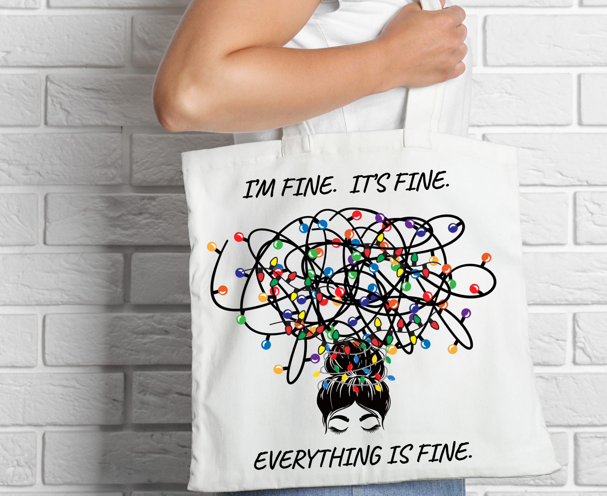 This funny and relatable tote features a girl with a messy bun and a tangled cluster of holiday lights hovering above her head—perfectly capturing that “totally fine, kind of” vibe. Spacious, sturdy, and stylish, it’s the perfect everyday bag for hauling groceries, books, work gear, or just all of life’s chaos.