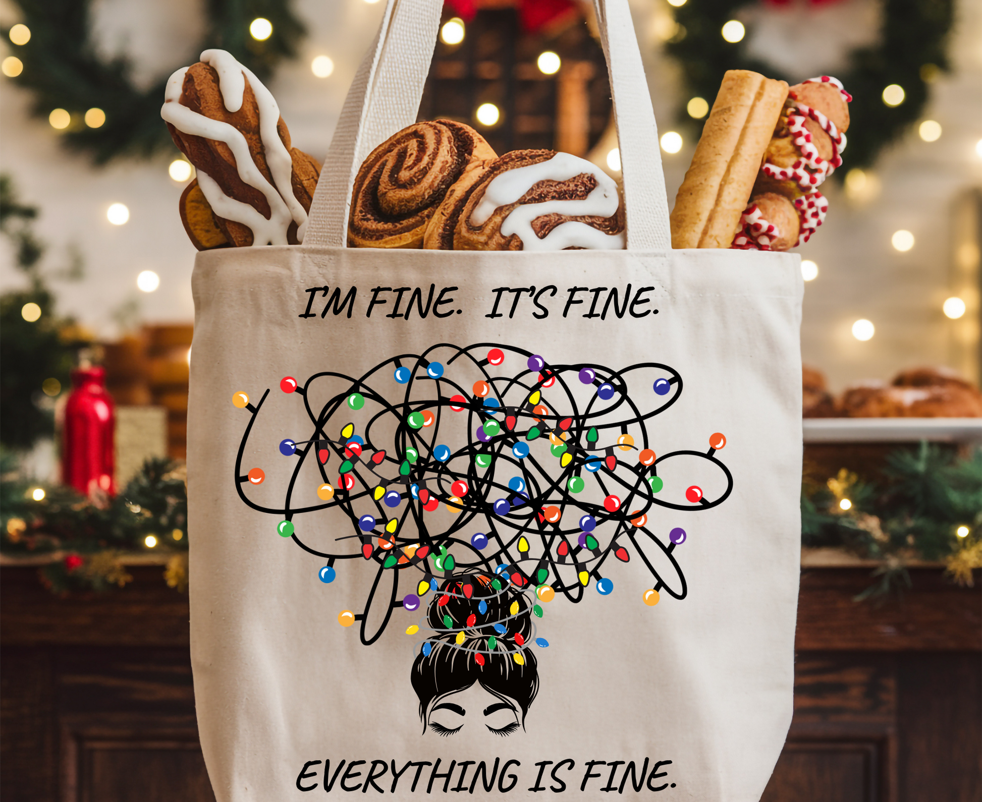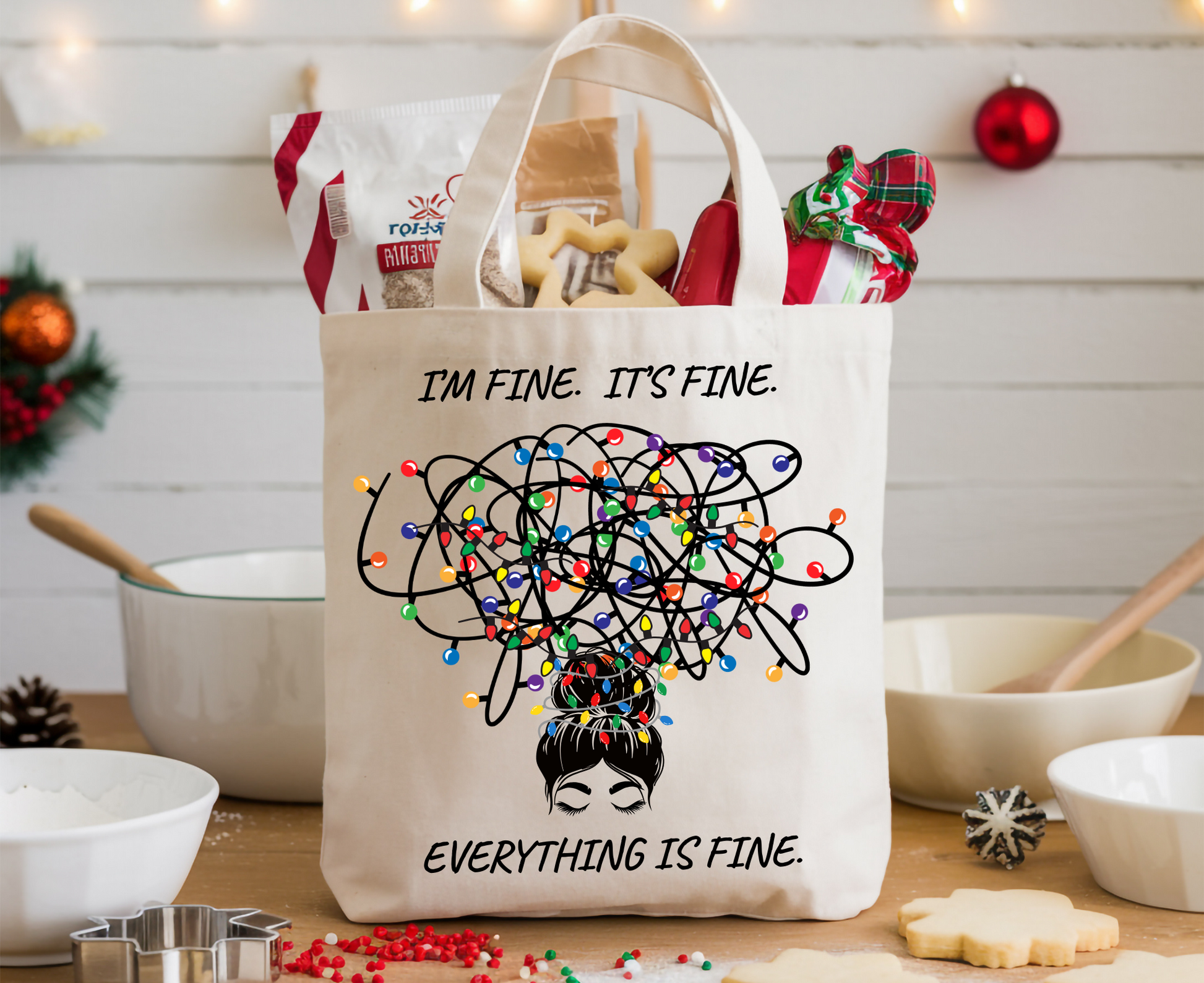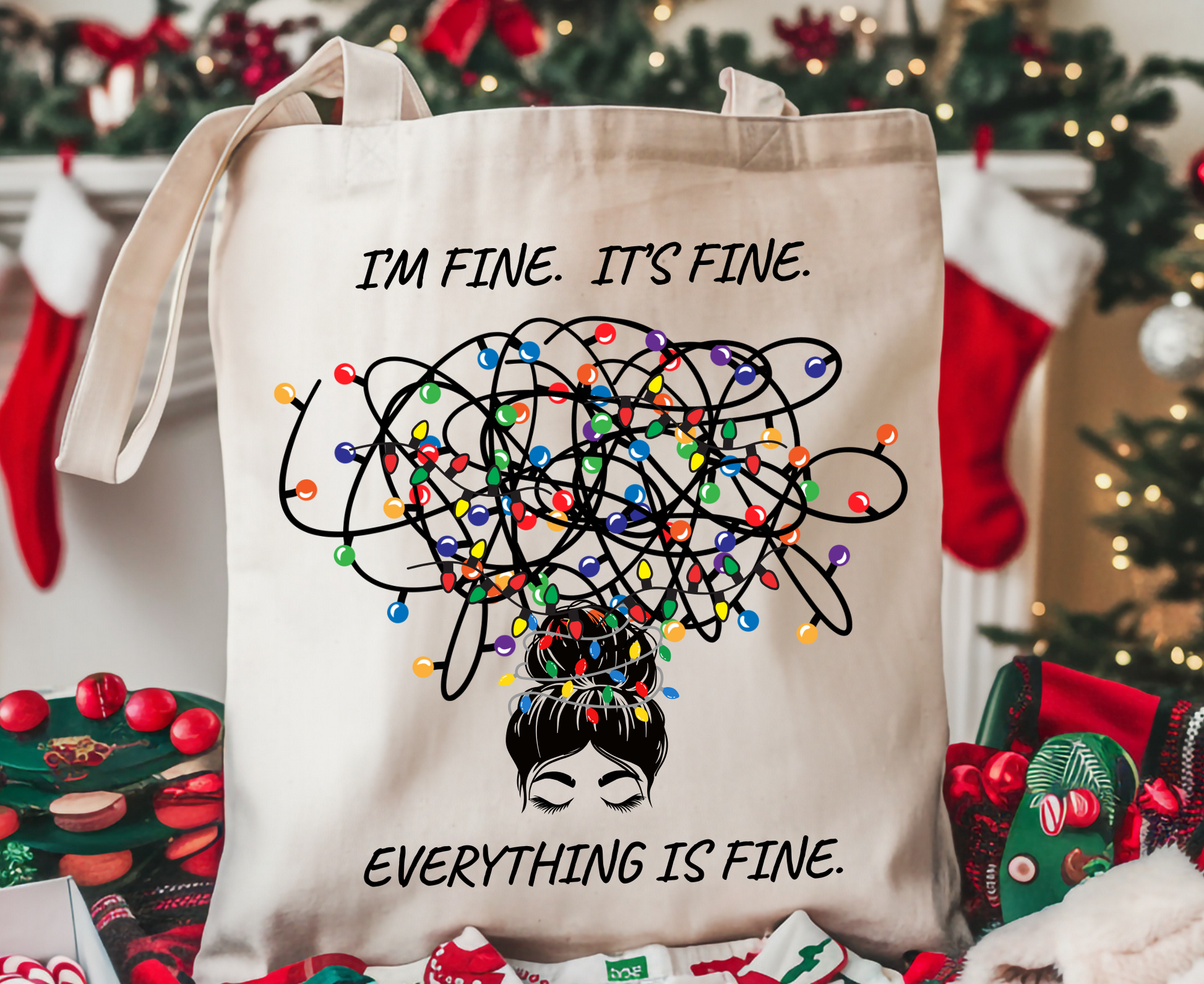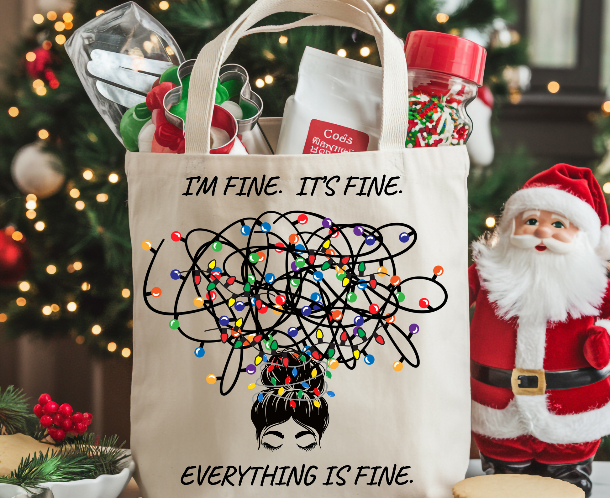 Funny Christmas Tote Bag: Holiday Humor Gift| I'm Fine. It's Fine. Everything is Fine