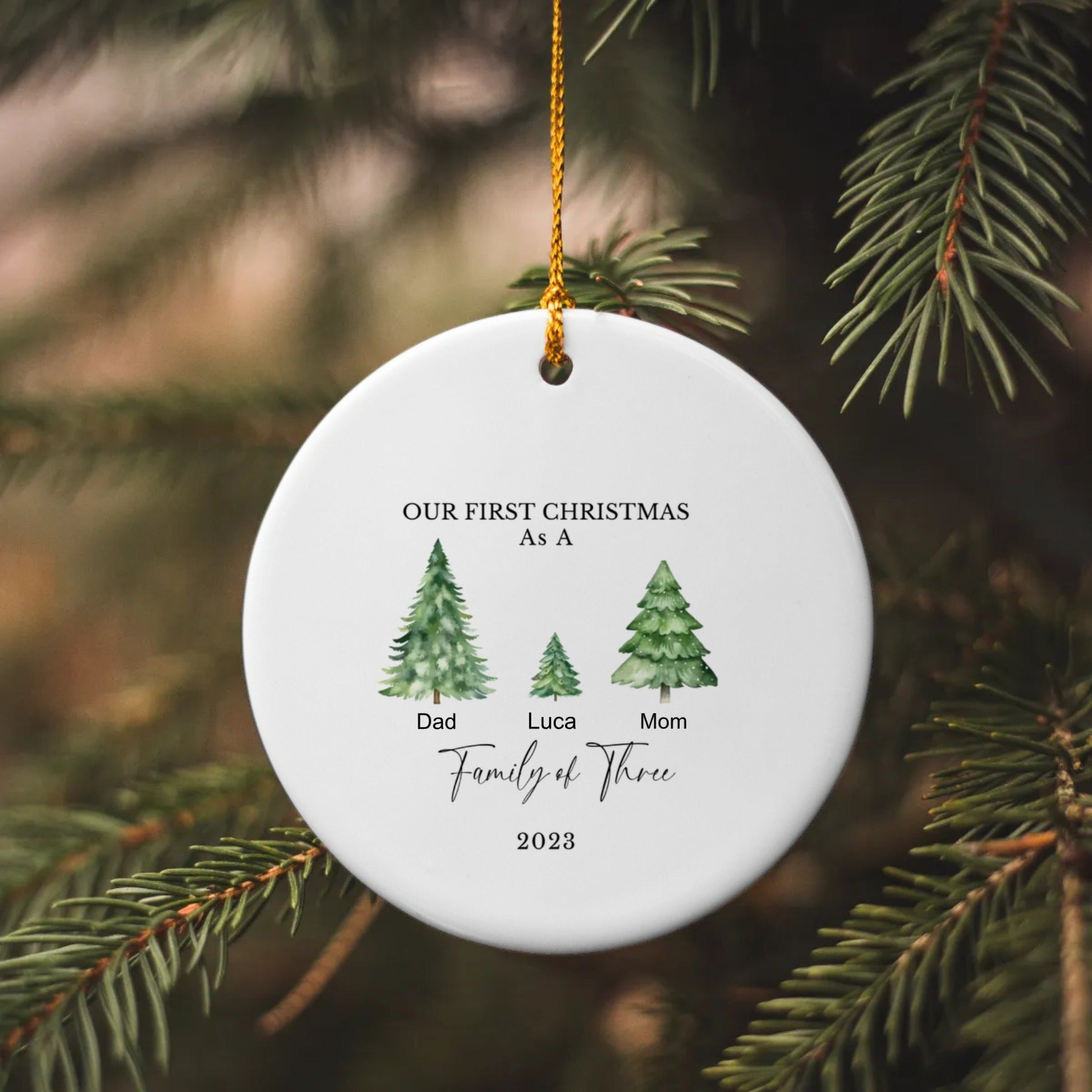 Bring warmth and love to your holiday tree with our custom ceramic circle ornament, featuring a festive pine tree family design. Two tall Christmas pines stand proudly with a baby pine in the center, representing your beautiful family of three.